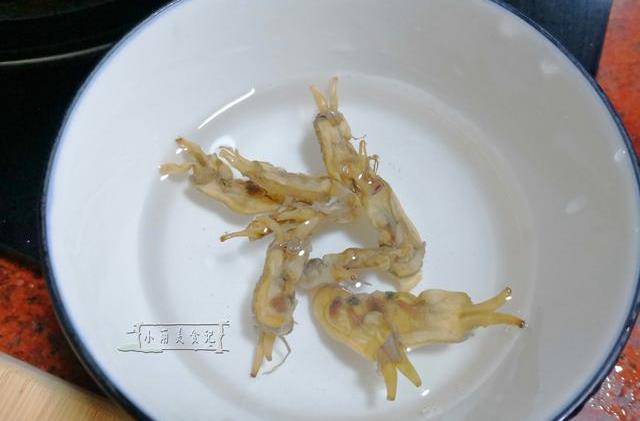 4、这里准备的是海蛏干,将海蛏干放入碗中进行冲洗浸泡。蛏干温水泡发20分钟,捞出后去除沙包,然后换两次清水清洗,充分去除腥味。