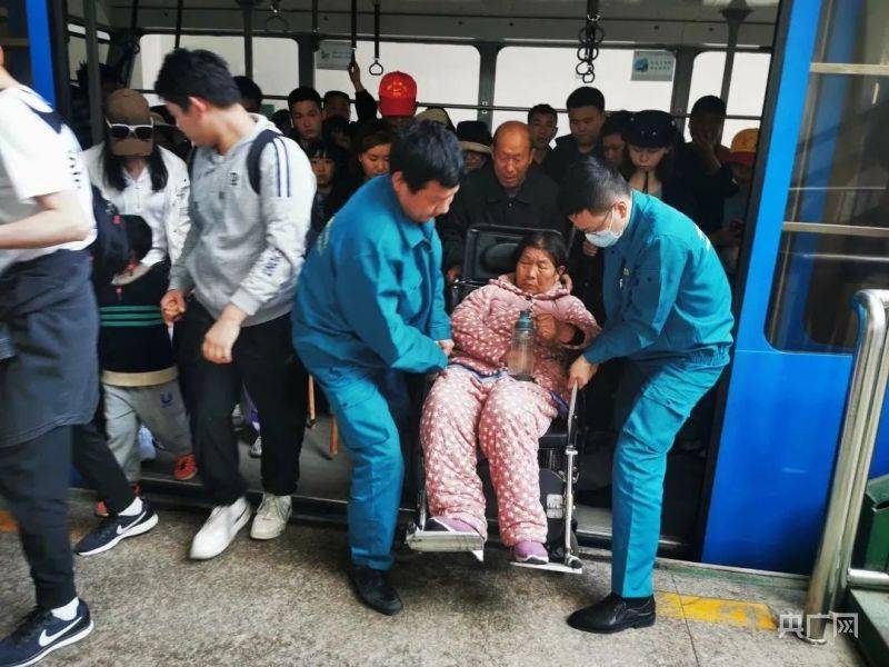 景区工作人员为老人安排轮椅并帮助上下索道(央广网发 徐丽霞摄)