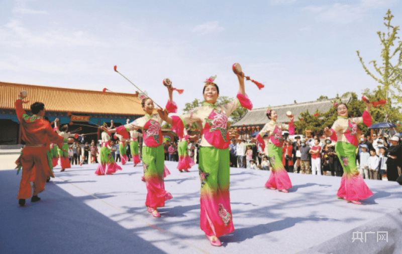 5月2日,凤阳县把国家级非物质文化遗产凤阳花鼓搬上明皇陵景区的假日舞台,让游客流连忘返(央广网发 吴晓泉摄)