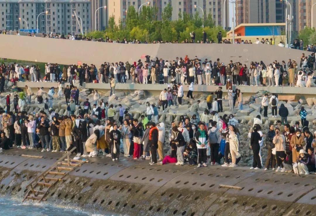 4月22日凌晨,“日出东疆”看海专线正式发车。从那天起,即使刮风、下雨,仍然有一批批怀着“逐日梦”的游客乘着公交车向海边出发。“五一”小长假的第一天凌晨,看海专线在阴雨中运送了830余名乘客,第二天凌晨天气晴好,乘客激增至2770余人,第三天再次突破至2818人次。日出时分的东疆亲海公园,一片“人从众”的景象。