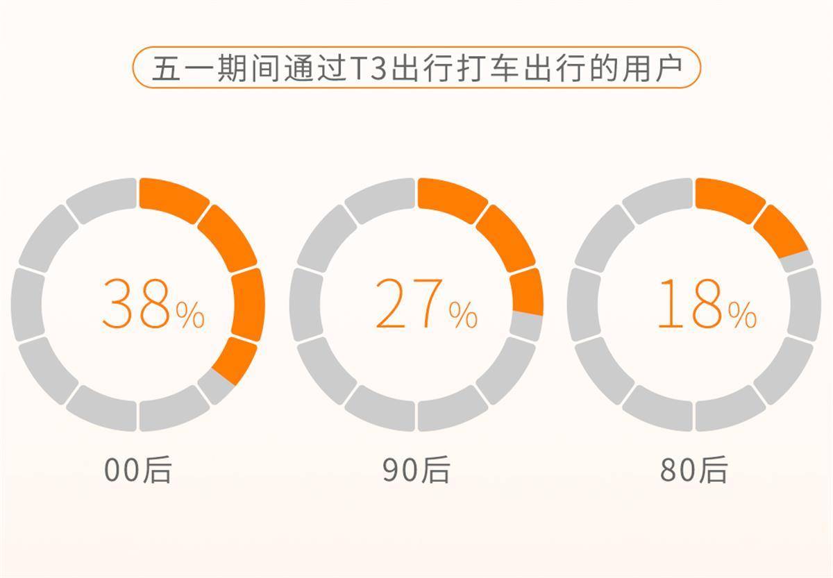 在五一出行人群中,年轻人成为出行主力军。五一期间通过T3出行打车出行的用户中,00后以38%的占比,排在第一位;其次是90后,所占比例为27%;80后位居第三位,占比达18%。