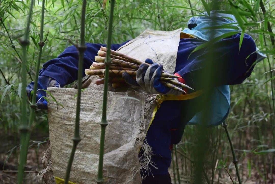 美食与时间往往是一场竞速赛,轻掰、轻折、轻入筐,借助最原始的人工采摘方式,笋农们用勤劳的双手将新鲜的竹笋带下大山。