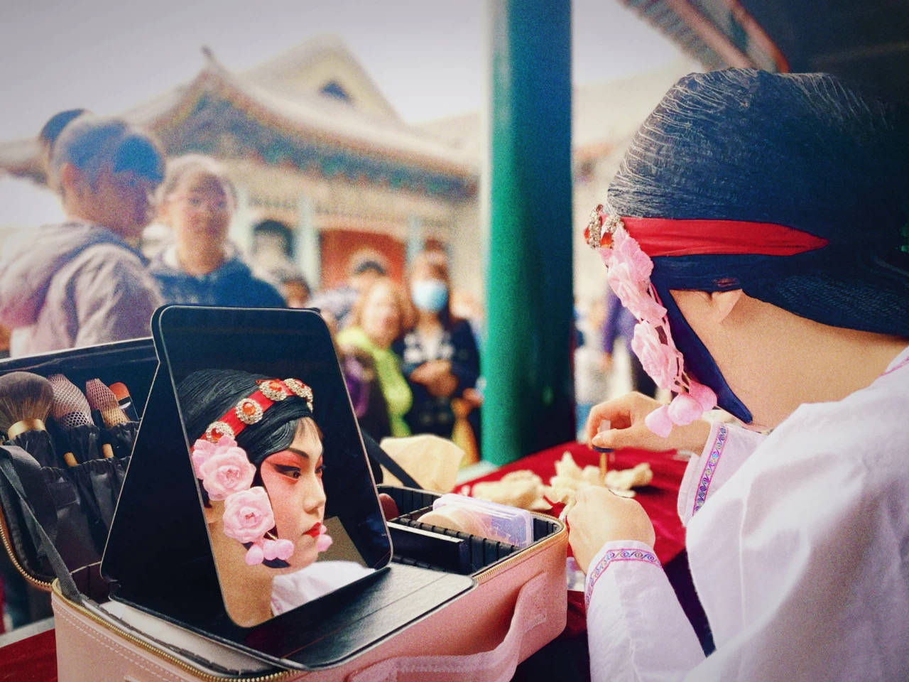 沈阳故宫博物院内,演出前,演员在戏台廊下“扮戏”。沈阳故宫博物院供图。
