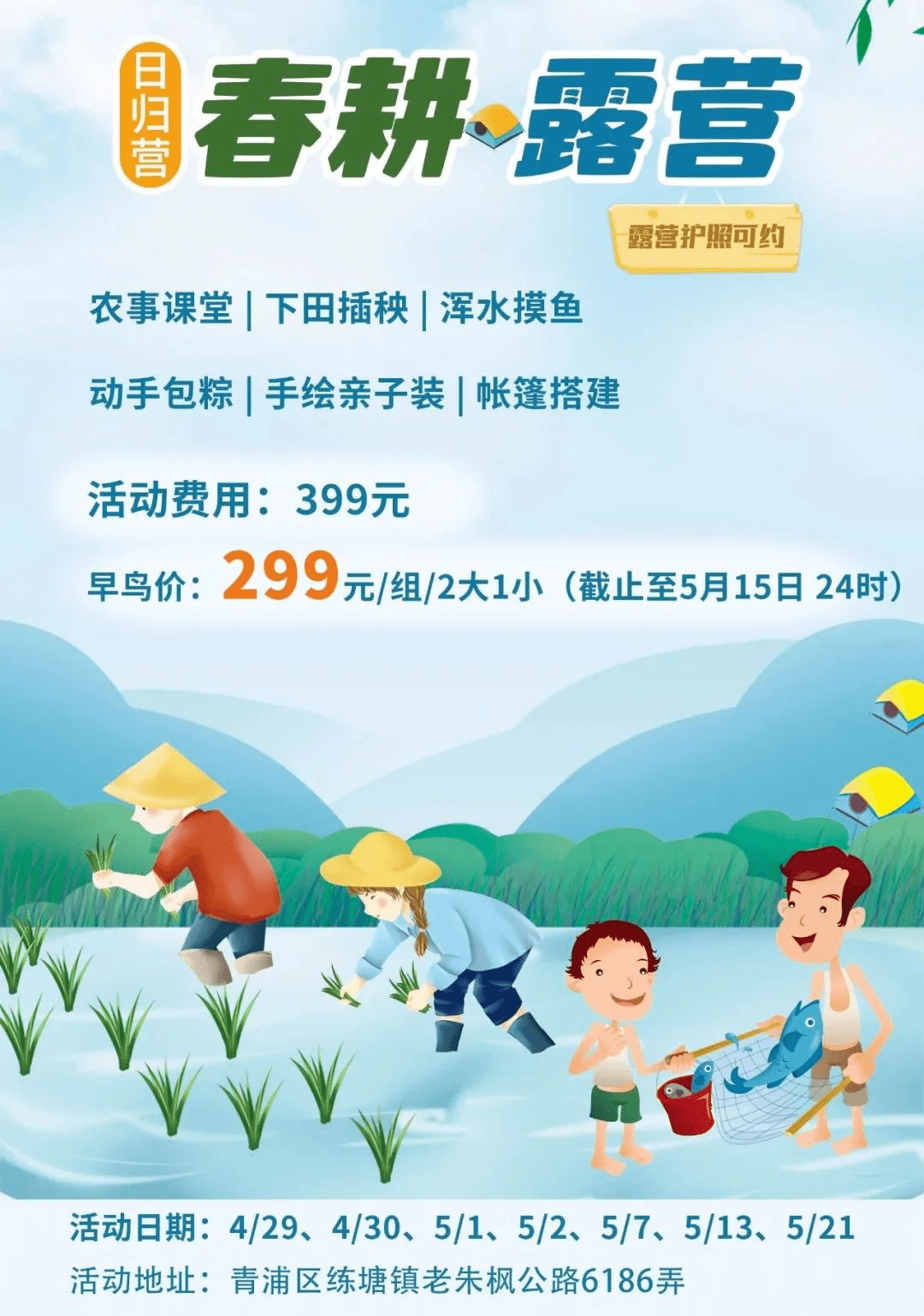 -活动:手绘亲子装(两件T-恤)、DIY粽子(4个)、稻田纪念章一枚、农事小课堂、插秧体验、浑水模鱼、亲子互动;