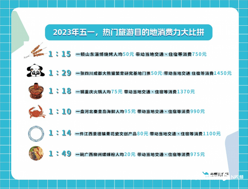 去哪儿大数据研究院估算了一笔账,吃一顿山东淄博烧烤人均消费50元,带动当地交通、住宿等消费750元;一张四川成都大熊猫繁育研究基地门票仅需50元,带动当地交通、住宿等消费1450元;一碗广西柳州螺蛳粉人均20元 带动当地交通、住宿等消费975元……这些看似不起眼的旅游标签,凭借百元消费撬动了十余倍的消费力。