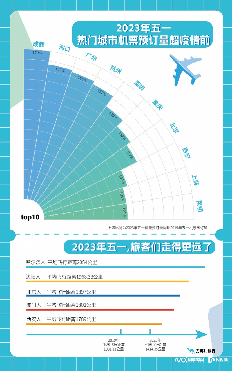 去哪儿平台上,今年五一,国内热门城市机票预订量超过疫情前五成,五一前(4月28日)离港旅客量已超过历年五一峰值(2021年4月30日)。热门出发地为成都、北京、深圳、广州、上海、重庆、昆明、西安、杭州、海口。2023年五一,旅客走得更远了,平均飞行距离增长至1414.95公里。