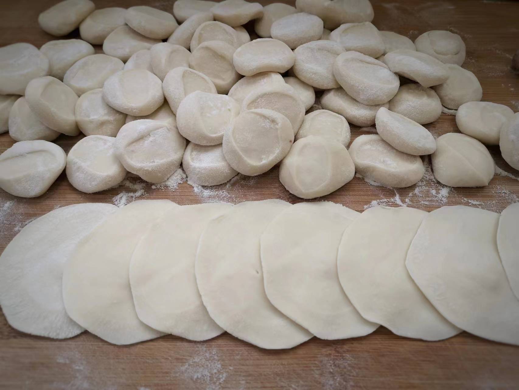 6、面团是我提前和好的,面团移至在案板上,揉搓整理成长条状,然后分成大小适中的面剂子,将其擀成饺子皮。