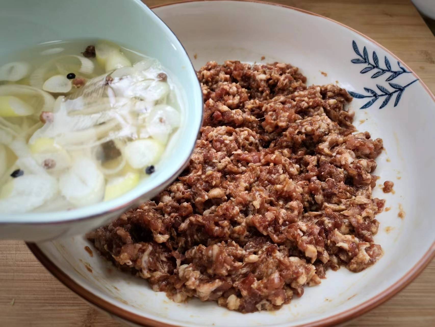 4、准备适量的大葱成段,生姜切成薄片,少许花椒放入碗中,加入适量开水,浸泡10几分钟,释放出葱姜和花椒的香味,然后把葱姜水分三次加入肉馅里面。