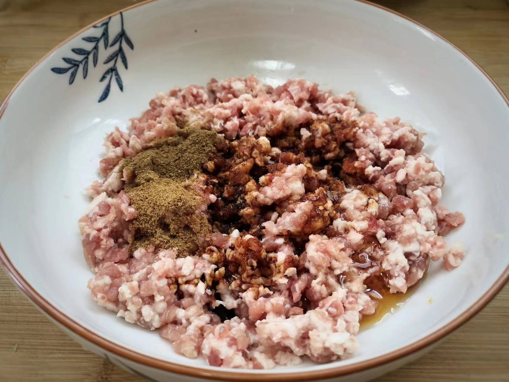 3、剁好的猪肉末放入一个碗中,加上点生抽和老抽,食盐花椒粉调味,适量香油将其充分搅拌均匀。