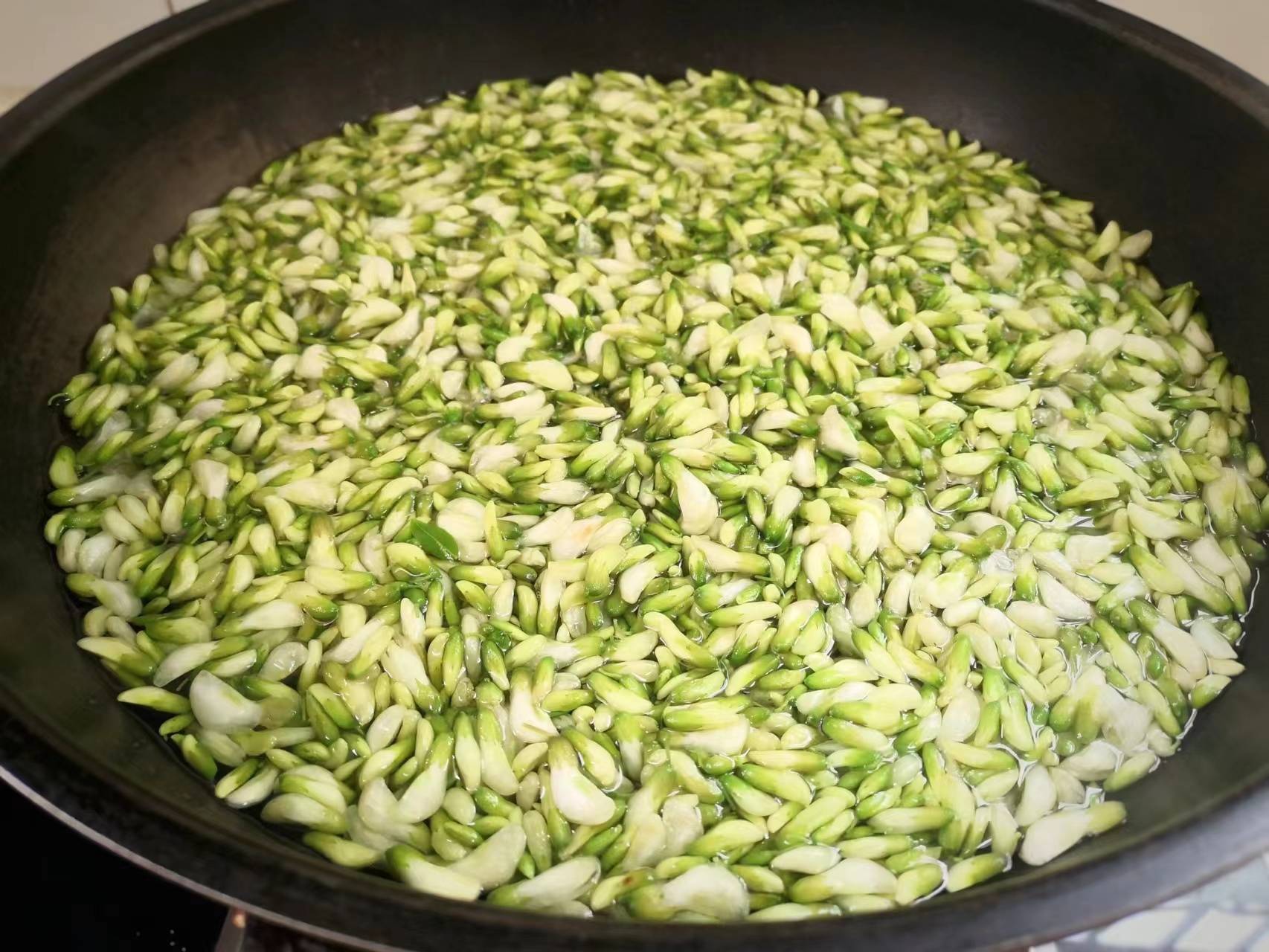 2、锅里放适量水,烧开以后放少许的盐进去,然后再把槐花倒进去,焯水30秒左右,关火,槐花捞出来放到凉水的盆里凉一下,然后攥干水分。