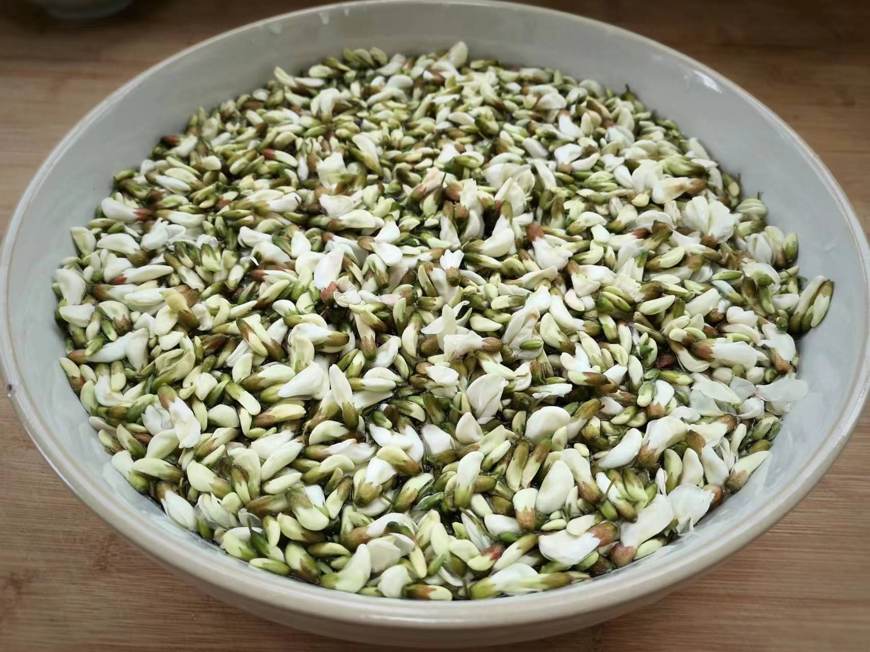 1、准备适量的槐花,槐花选择半开不开的味道是最好,把花里带的叶子,小枝条全都去除,只留下花朵就行,用清水多淘洗几遍,控一控其中的水分。