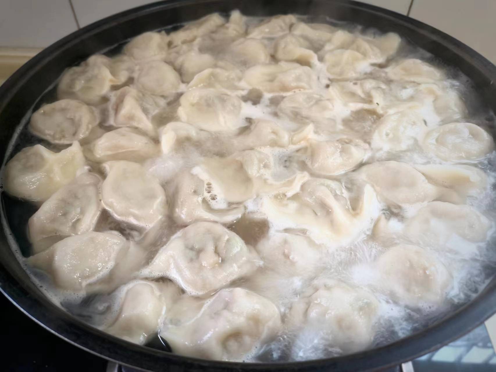 7、取适量馅放在皮中间,捏合捏紧包成饺子,锅内加冷水烧开,撒入适量食盐搅匀,下入饺子轻轻推散,再次烧开后,然后连续添3次冷水,直到最后一次烧开,看着饺子鼓肚,即可盛出装盘食用。