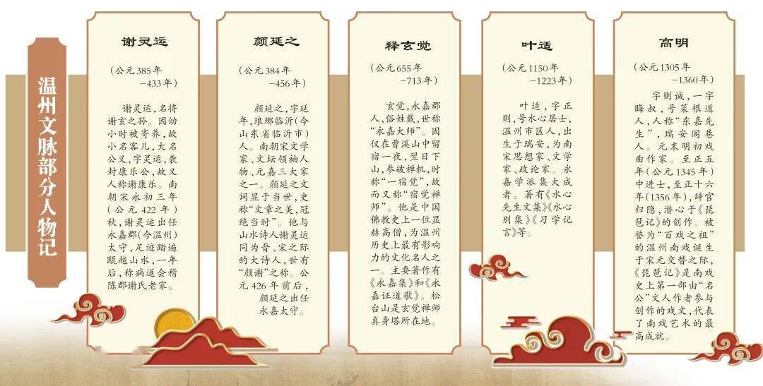 两晋南北朝时期,北方士族大量南迁。就永嘉郡守而言,名士中除了谢灵运,还有裴松之、颜延之、丘迟等人。这些先后来到温州的当时顶尖士人,赋予了这座城市最初的风雅气质。