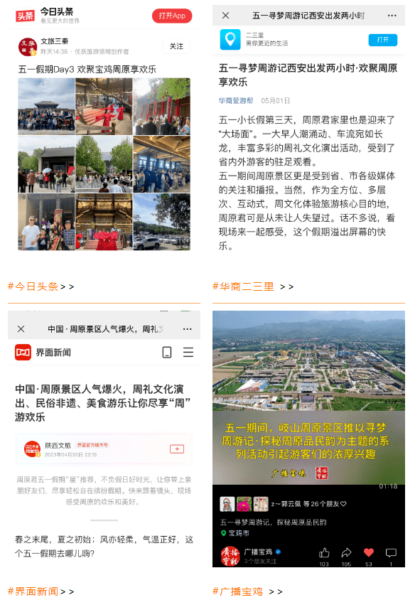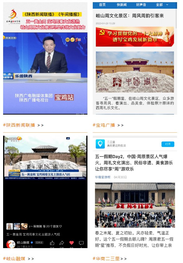 5月1日,岐山县周文化景区丰富多彩的周文化主题活动受到《陕西新闻联播》《午间播报》等各级省、市媒体的报道,吸引了省内外观众的一致好评。