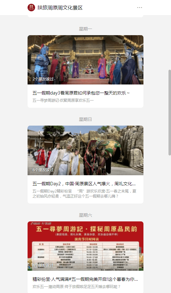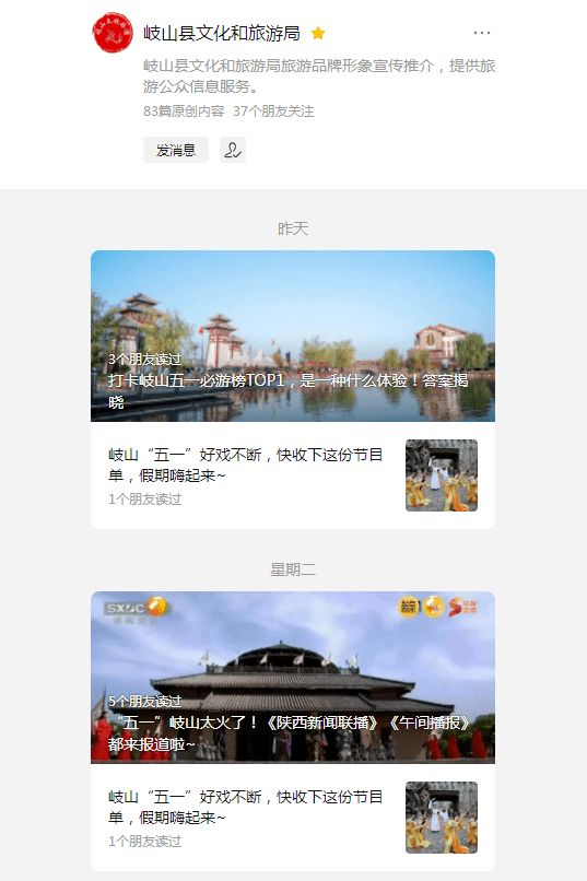 假日期间,岐山县周文化景区、五丈原景区及三国小镇等景区每天在其微信公众号、抖音号等对景区假日文化旅游活动进行宣传推广。