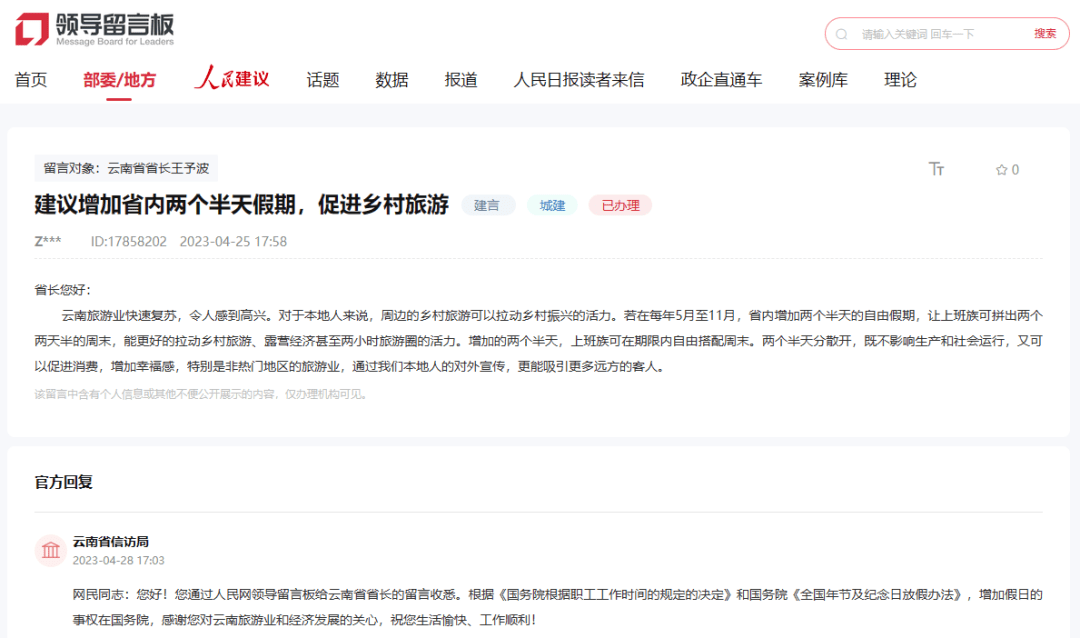 有网友在人民网—领导留言板上建议,在每年5月至11月,云南省省内增加两个半天的自由假期,让上班族可拼出两个两天半的周末,促进乡村旅游。