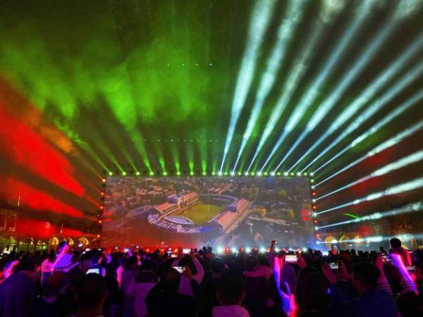 沉浸光影大秀在民园广场上演,二百余盏激光灯同时点亮,用光影和数字艺术点亮空间,让城市焕发新的活力。(文字/郑妍 摄影/王津)