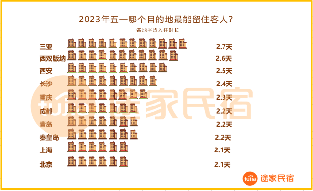 游客来去匆匆,景区人从众,哪个目的地最能留住人?从入住时长看,第一梯队为三亚、西双版纳和西安,平均入住时长达2.5天;长沙、重庆排在第二梯队,平均入住时长超2.3天;成都、青岛、秦皇岛等地紧随其后,平均入住时间达2.2天。