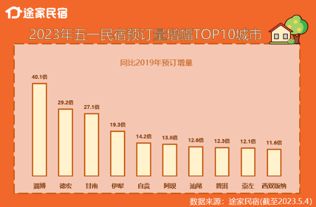 从预订量增幅看,小众及新晋热门城市增长最快。淄博同比2019年增长近40倍,排名第一。德宏、甘南、伊犁、自贡、阿坝、汕尾、普洱等小众目的地预订量增幅均超2019年同期10倍以上。此外,途家平台上,淄博、平潭、威海、湖州等多个热门目的地五一民宿近乎满房。