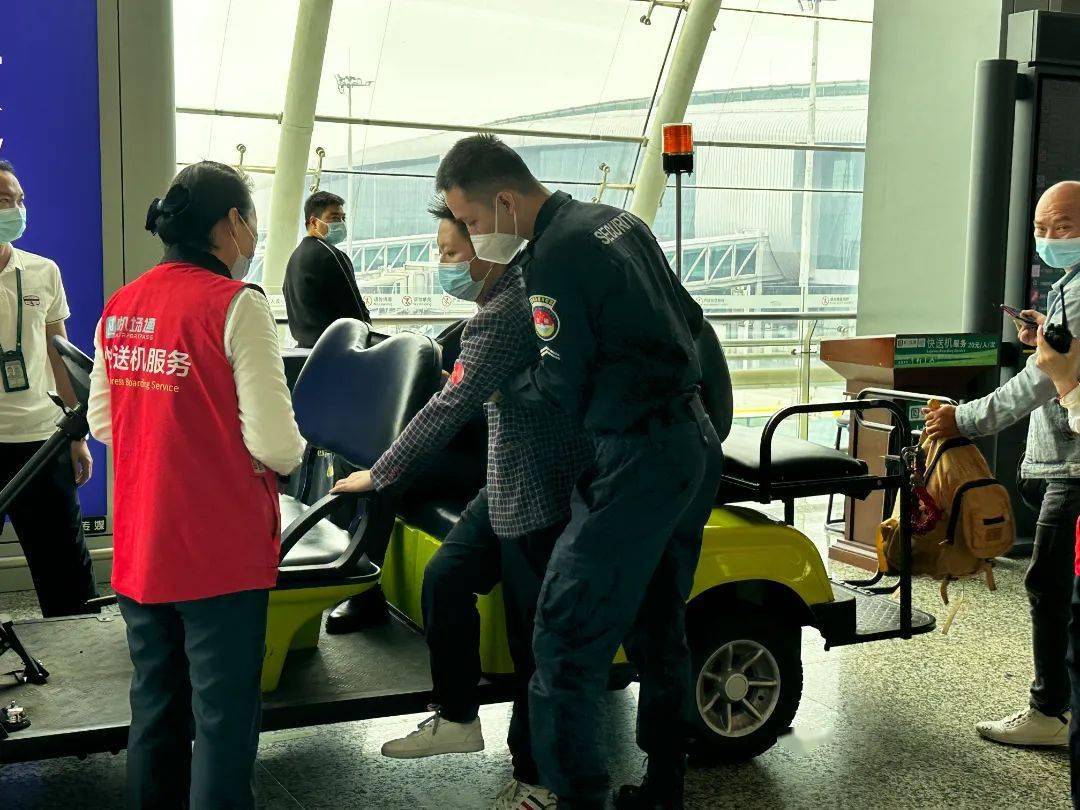 一号航站楼B区安检通道,一位中年男性旅客由于腿脚不便行动很是吃力,踉踉跄跄地行走着。安检员小朱见状急步上前,在征得旅客同意后,小朱搀扶着旅客缓缓来到安全门进行人身检查,嘴里还不停提醒:“您别着急,您抓稳了!”。周围旅客见状纷纷让出一个“安全距离”,并不约而同地对小朱竖起了大拇指。待旅客通过安检后,小朱又细心地将黄先生扶上了电瓶车,目送旅客乘车前往登机口。