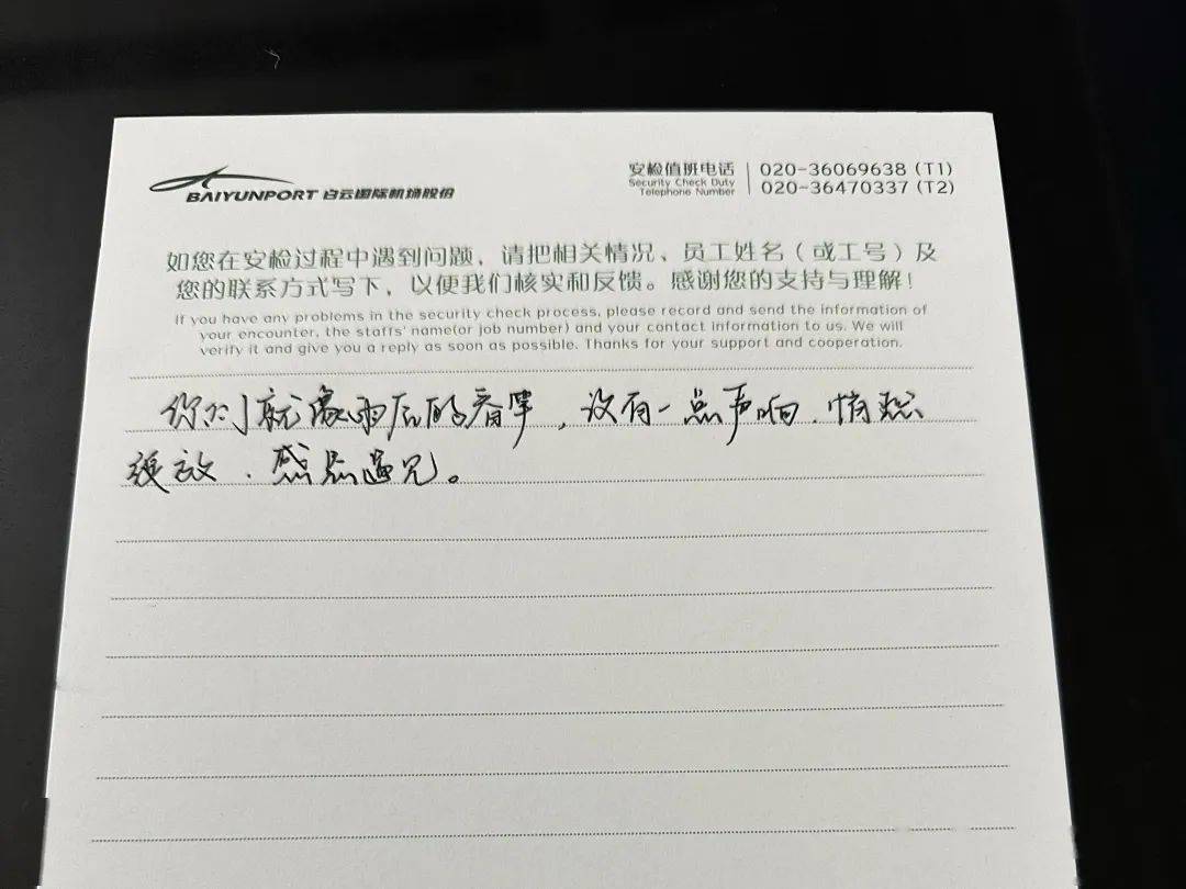 在人身检查时,细心的小戴发现叶阿姨的裤脚和后背都被雨水淋湿,她轻声跟叶阿姨说道:“衣服打湿了穿着,容易感冒,要擦干才行呢!”旅客叶阿姨本以为小戴只是随口一说,本没在意,但看到小翠转身拿来了纸巾,请叶阿姨坐下,一边帮她擦拭残留的雨水,一边为她耐心介绍乘坐飞机流程和注意事项。叶阿姨感激地说:“孩子,你们真是太贴心了!”随后叶阿姨在留言板上写道:“你们就像雨后的春笋,没有一点声响,悄然绽放,感恩遇见”。
