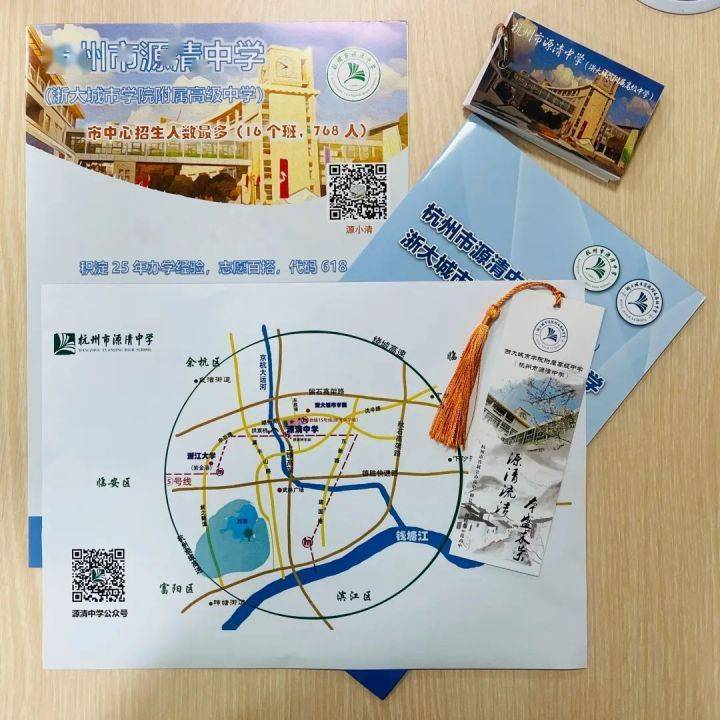 胡女士展示源清中学给家长提供的资料袋里的物品,包括地图、书签等