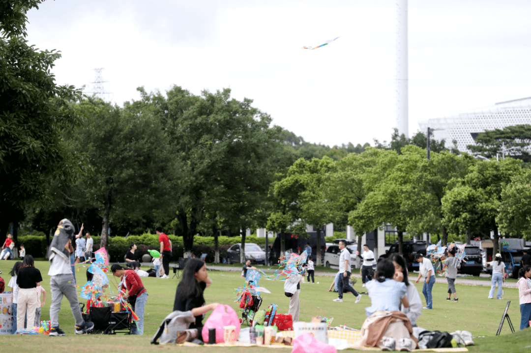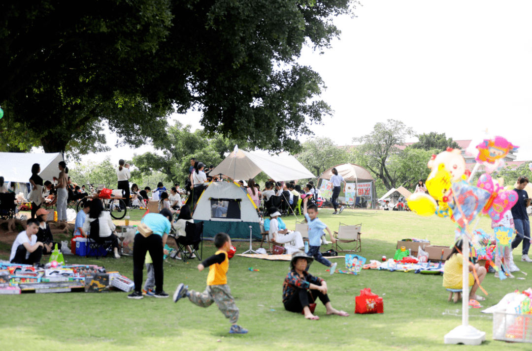 5月1日,天气晴朗,在 荔湖公园,一个个天幕、帐篷错落有致,有人玩游戏,有人唱歌,有人在放风筝,大家都在自然风光中享受着露营的乐趣。