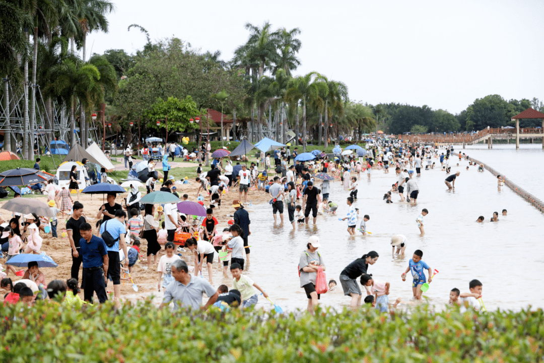 在 荔湖湿地,这个“五一”,人工沙滩人气大旺,用“人山人海”来形容一点都不为过。挖沙坑、堆城堡、围“水塘”·······现场大小朋友纷纷拿着沙滩玩具,玩得不亦乐乎。 “孩子天生对玩沙没有抵抗力,又不想跨市去看海,就选择来这里了。”来自荔城街的市民陈先生说道。