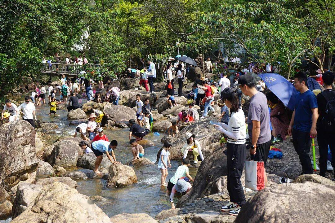 在景区的奇趣水谷,溪流从错落有致的石头间奔淌而下,奏响了一首假期愉悦之歌。不少游客停下脚步,在山间戏水,小朋友们拿着水枪、渔网尽情玩耍,情侣们拿出手机拍下合照,人与自然和谐共处的画卷徐徐展开。