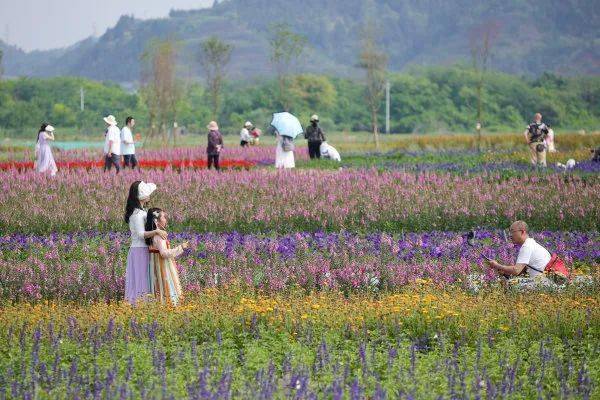 ▲位于四川省遂宁市圣平岛“花花世界”的百亩花海竞相开放,吸引了不少汉服爱好者、古筝爱好者、太极爱好者前来休闲打卡。刘昌松 摄
