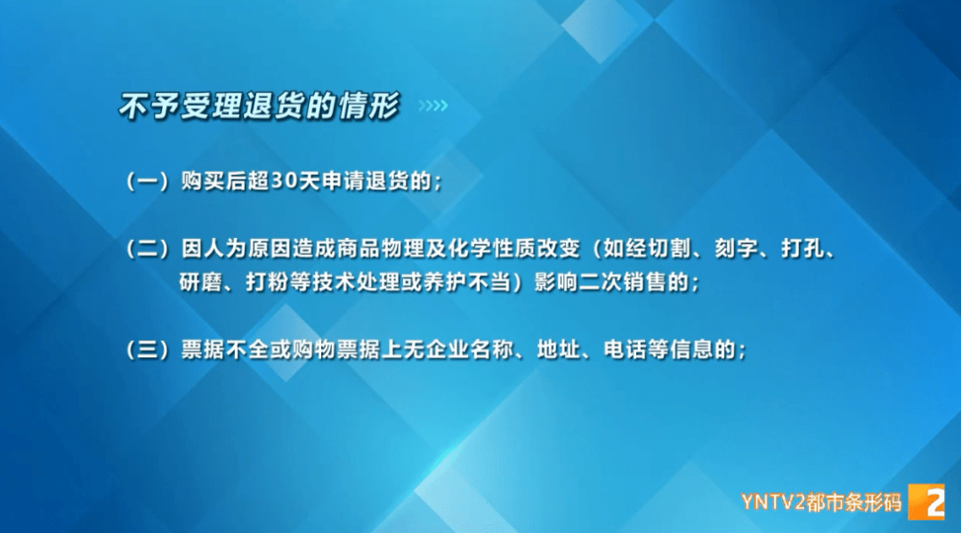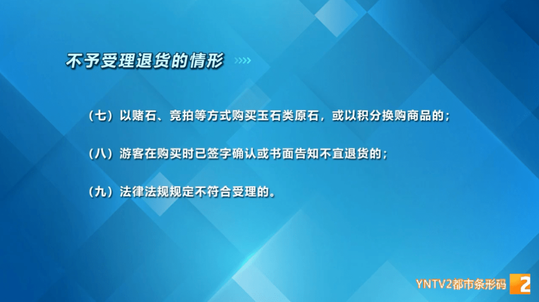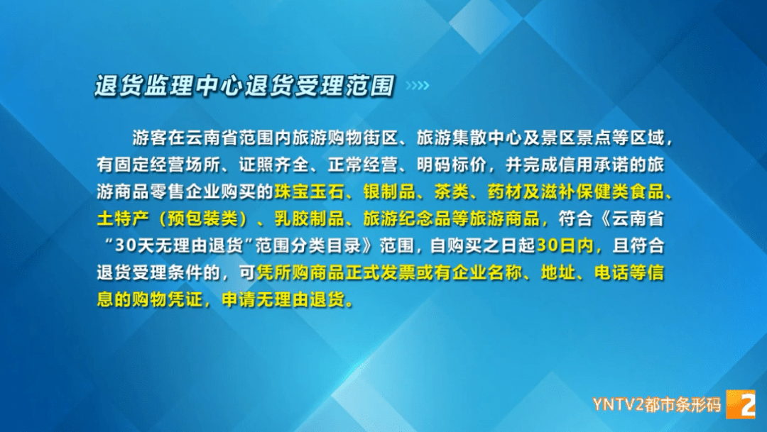 按照这一政策,游客在云南省内的旅游购物街区、旅游集散中心及景区景点等区域,有固定经营场所、证照齐全、正常经营、明码标价,并完成信用承诺的旅游商品零售企业所购买的 珠宝玉石、银制品、茶类、药材及滋补保健食品、土特产(预包装类)、乳胶制品、旅游纪念品等商品,自购买 30日内,可 凭商品正式发票或有企业名称、地址、电话等信息的购物凭证,申请无理由退货。