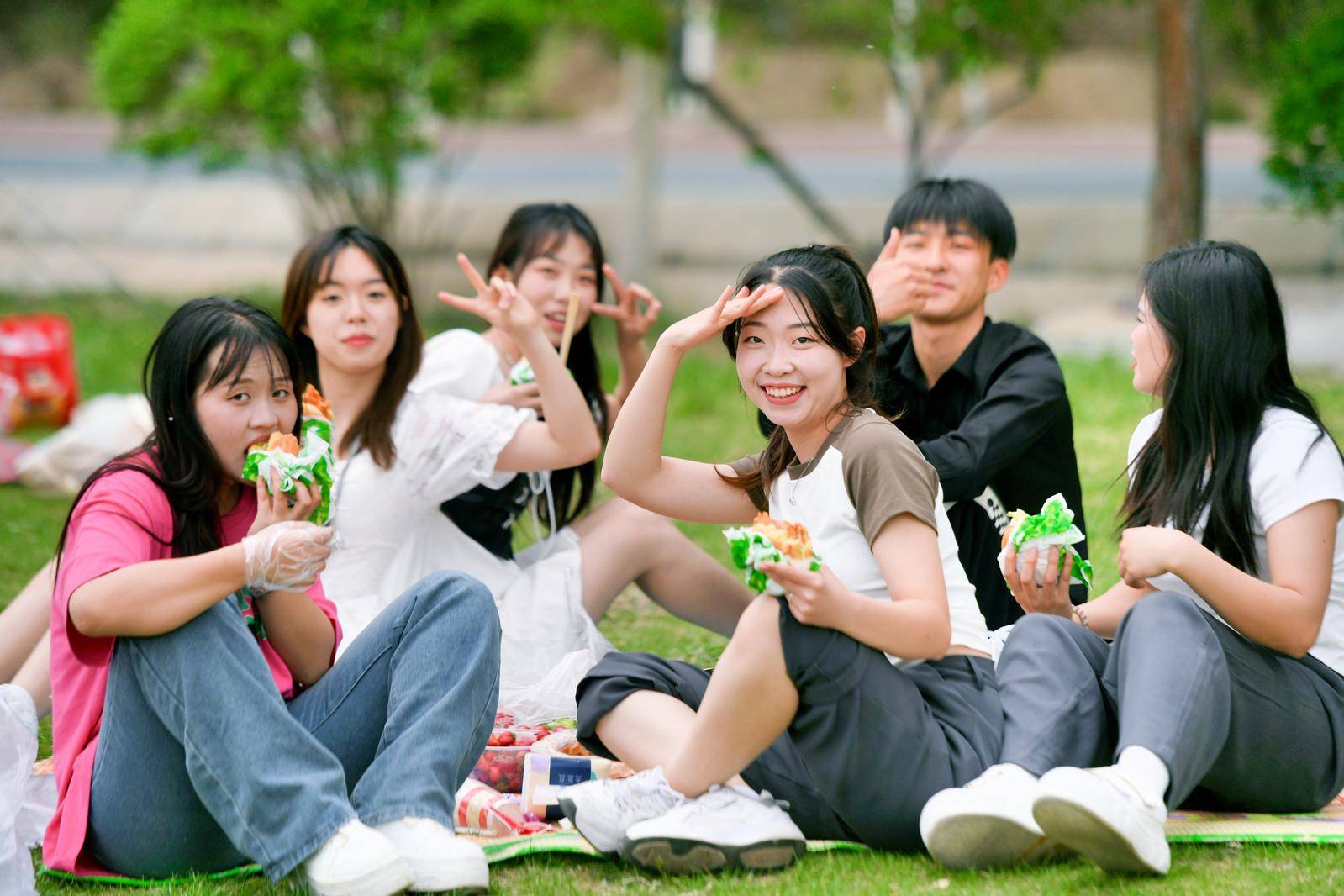 年轻人席地而坐享受美食。