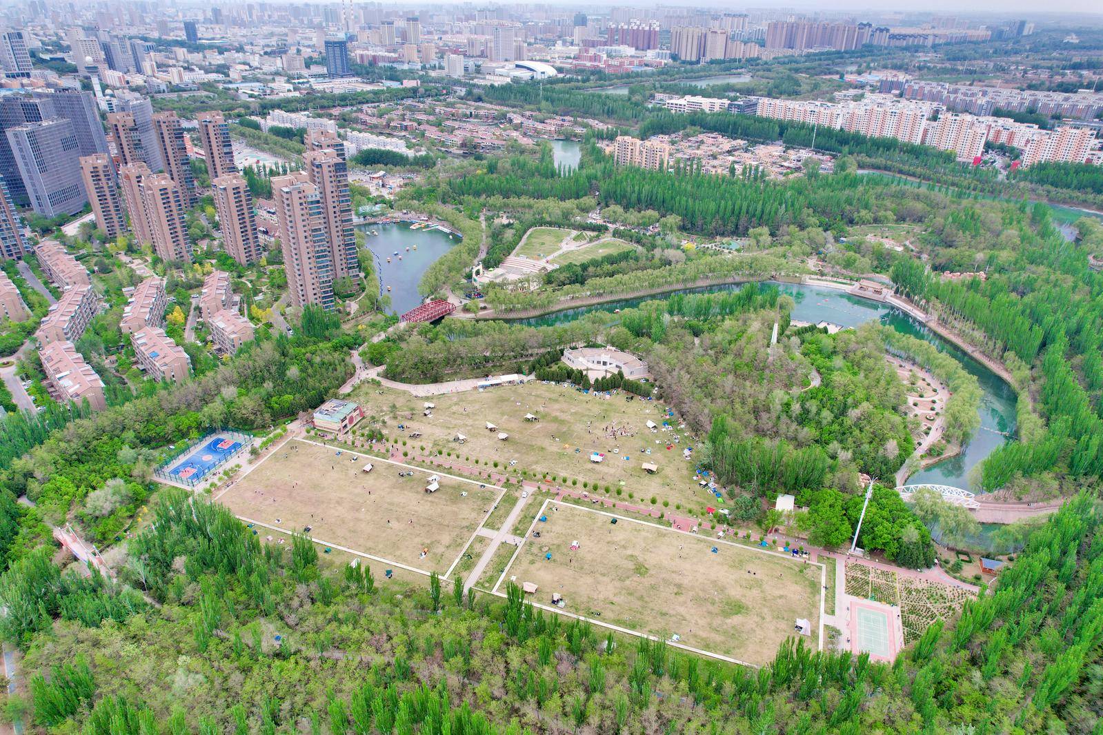 5月3日,银川森林公园城市共享绿地上,市民们在自己的帐篷前合影留念。当天是五一假期的最后一天,人们抓住假期的“尾巴”,扶老携幼走出家门,来到银川市多处城市共享绿地,他们在这里露营、踢球、野炊、放风筝……享受着这春末的美好时光。
