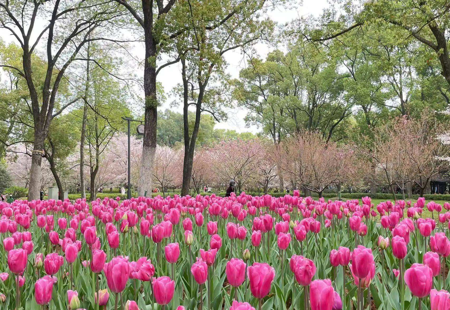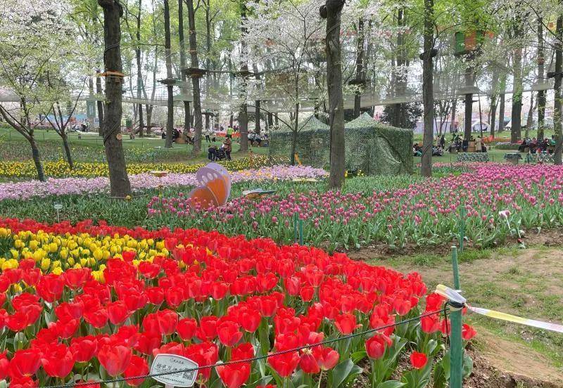 今年樱园中还种植了大片的郁金香,将一大片坡地装点得五彩缤纷,着实好看。