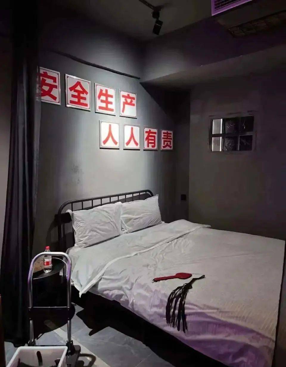 整个布置的就是一个纯狱风,床为了一圈铁栅栏,小皮鞭小蜡烛一应俱全。