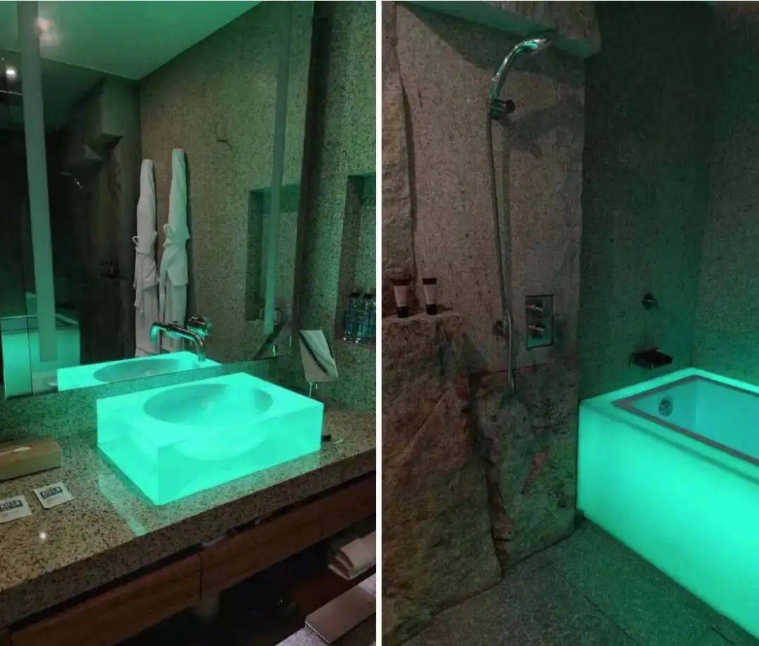 他住过的一个房间看起来有点高端,床很软,地砖很滑,氛围灯很全。