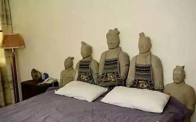 兵马俑主题酒店还提供看孩子服务,就让兵马俑往床头一站,就说你家小孩敢动不敢动。