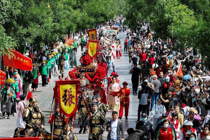 4月30日,游客在河南商丘古城观赏华服霓裳文化节巡游表演(无人机照片)。新华社发(温乾坤 摄)