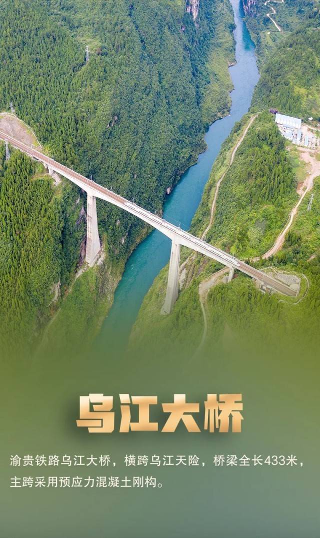 渝贵铁路全长347公里,设计时速200公里,全线桥梁共有209座,隧道共115座,桥隧比高达75.4%。乌江大桥是其代表桥梁。