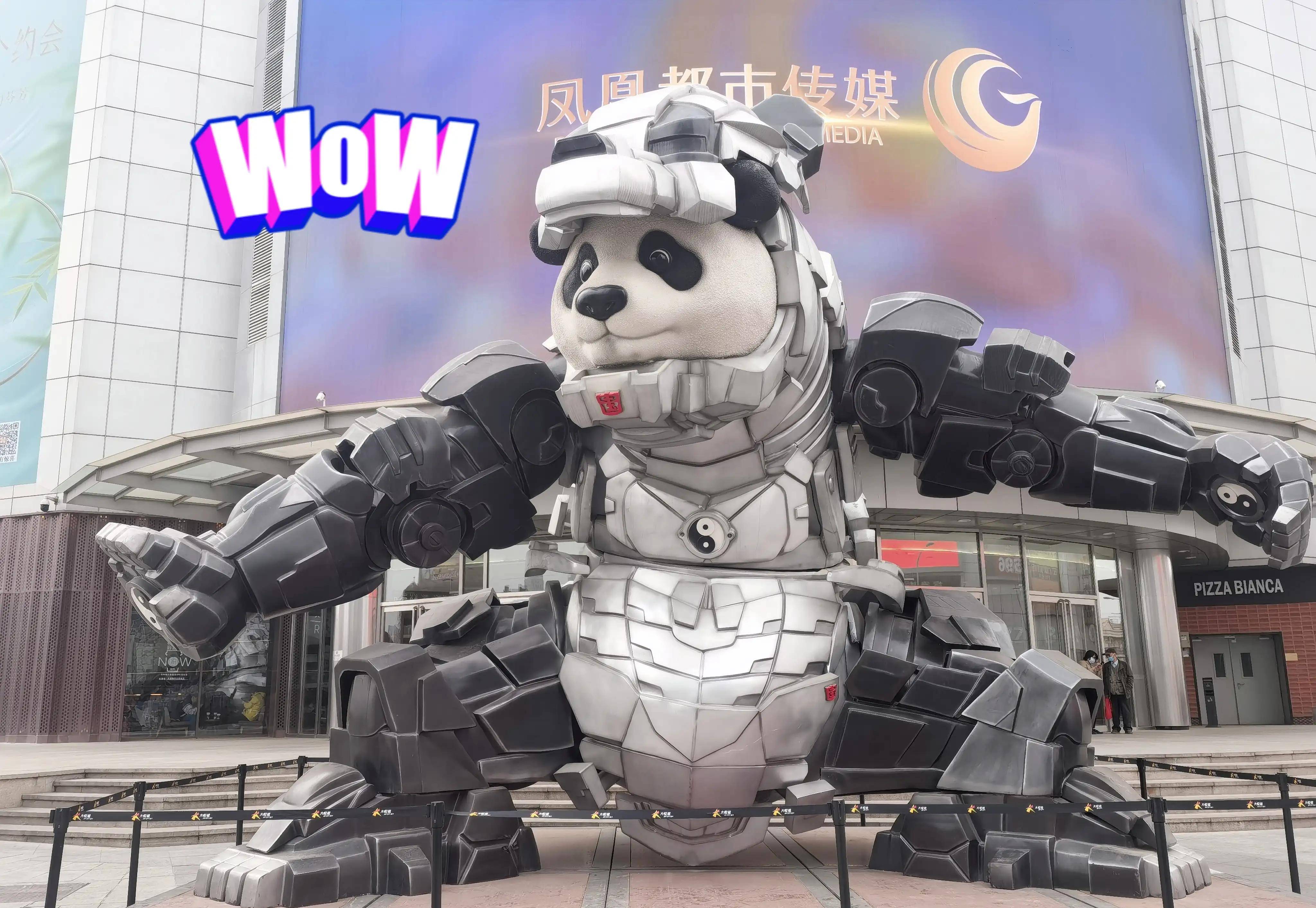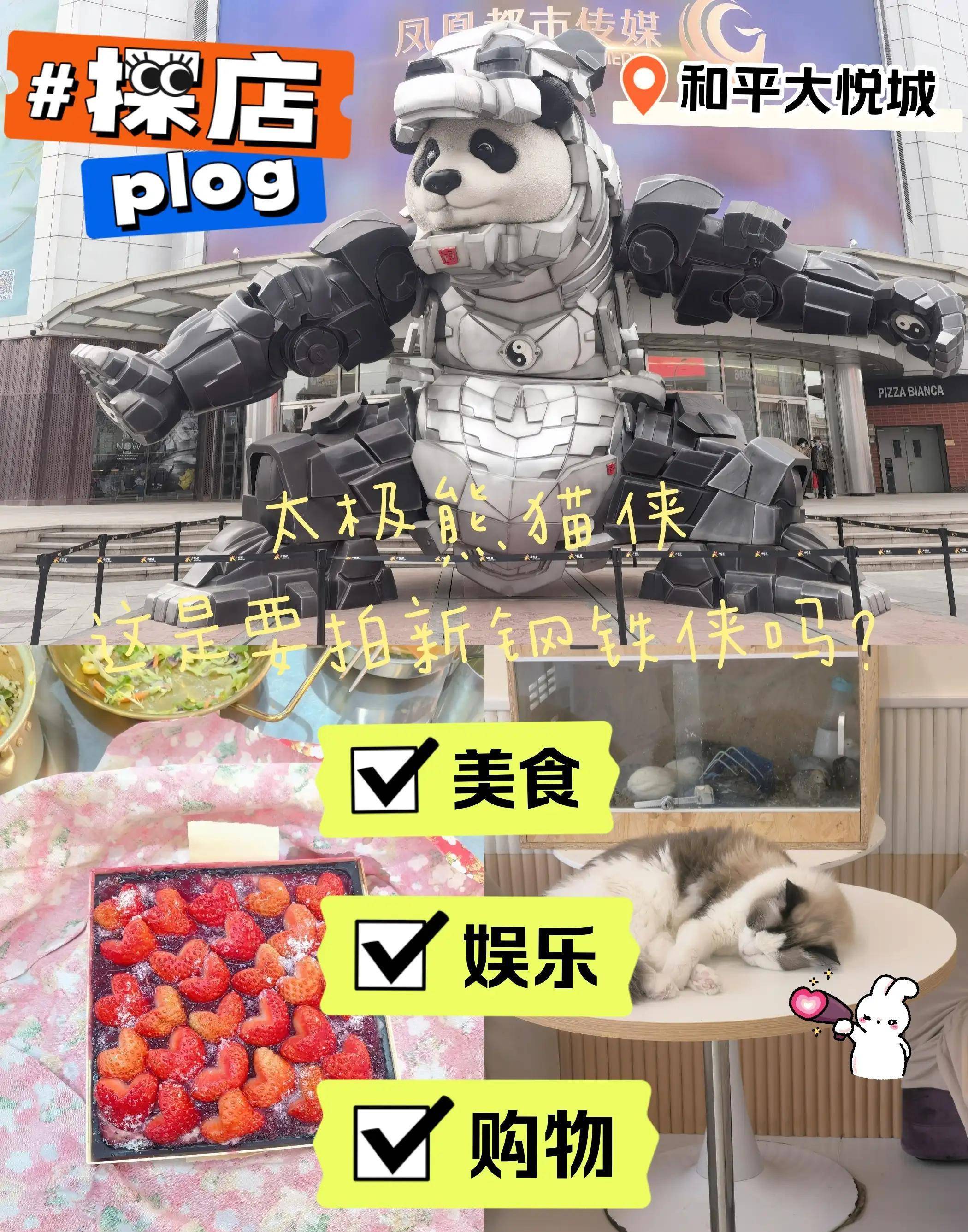 上午在五大道赏完花就溜达到和平大悦城了,发现这里又开了很多的新店,门口还摆着一个巨大的钢铁熊猫侠,这是要拍新钢铁侠还是变形金刚猛兽侠呢?