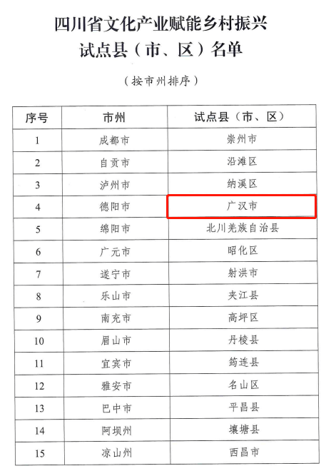 本次省级文化产业赋能乡村振兴试点评选,我市全面分析文化产业发展现状,充分提炼文化产业发展优势和亮点、总结乡村振兴实绩,形成了较为完善的申报材料通过审核,经专家组现场踏勘验收及答辩,顺利通过评审,广汉最终成为全省15个省级文化产业赋能乡村振兴试点县(市、区)之一,试点时间为2023年至2025年,试点工作将进一步深化推进探索文化产业赋能乡村振兴发展新路径。
