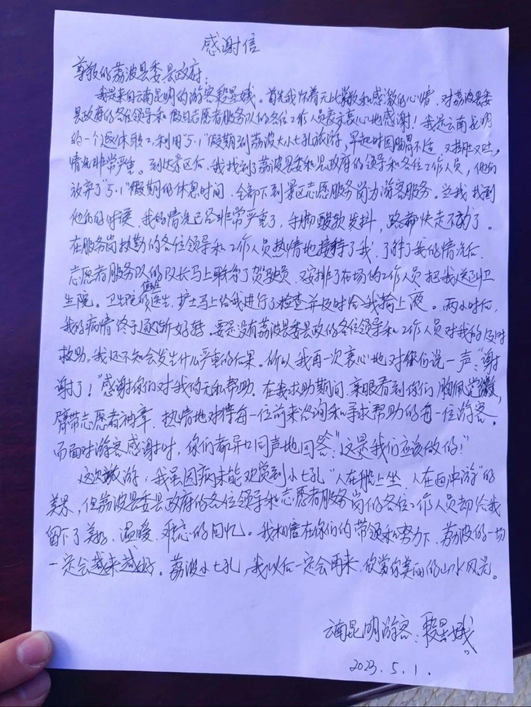 5月1日,来自昆明的游客段星娥给荔波写了一封手写感谢信,字里行间,满是感激之情,她在信中写到:“感谢你们对我的无私帮助。在我求助期间,亲眼看到你们胸佩党徽,臂戴志愿者袖章,热情地对待每一位前来咨询和求助的游客。”