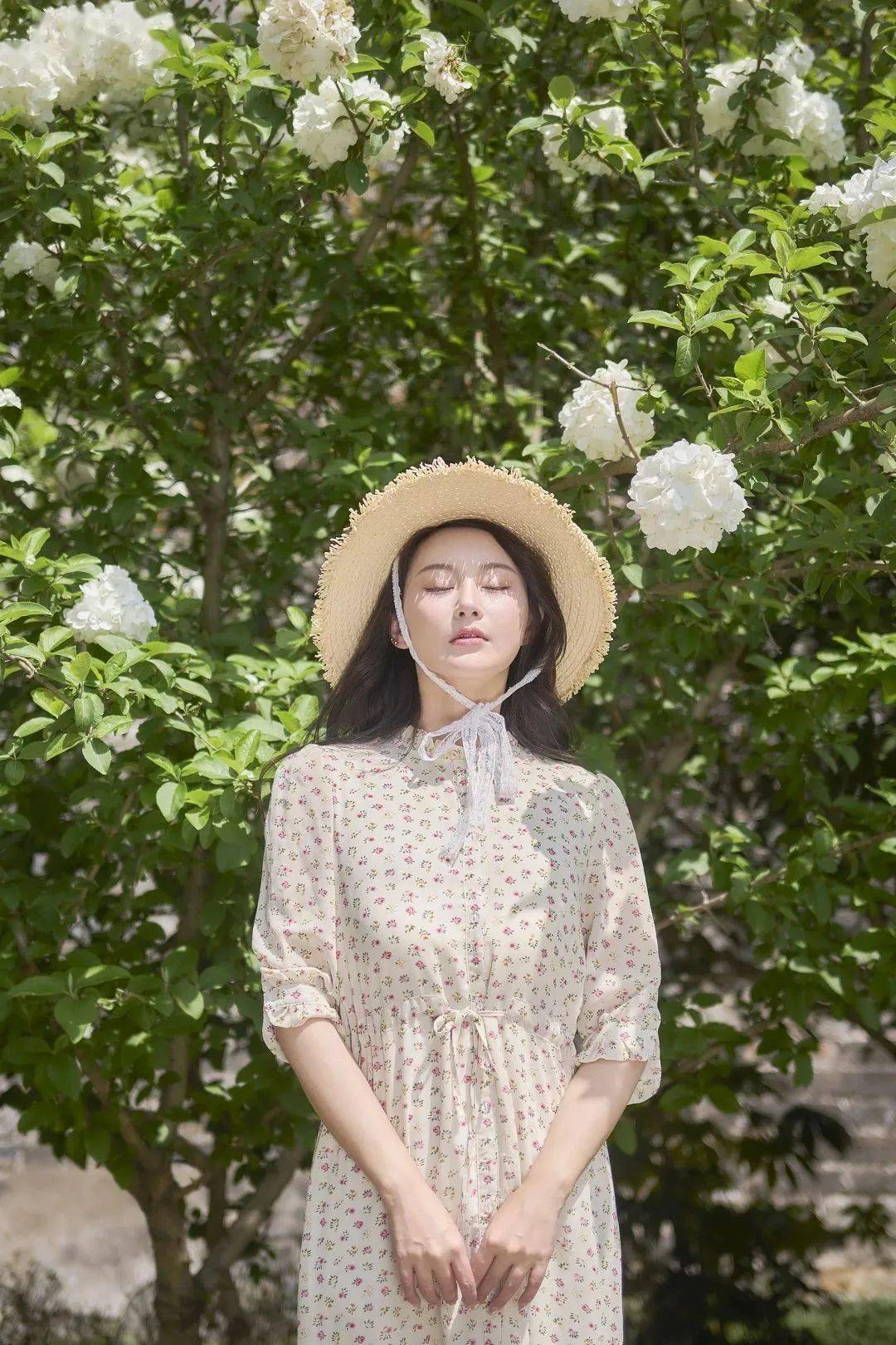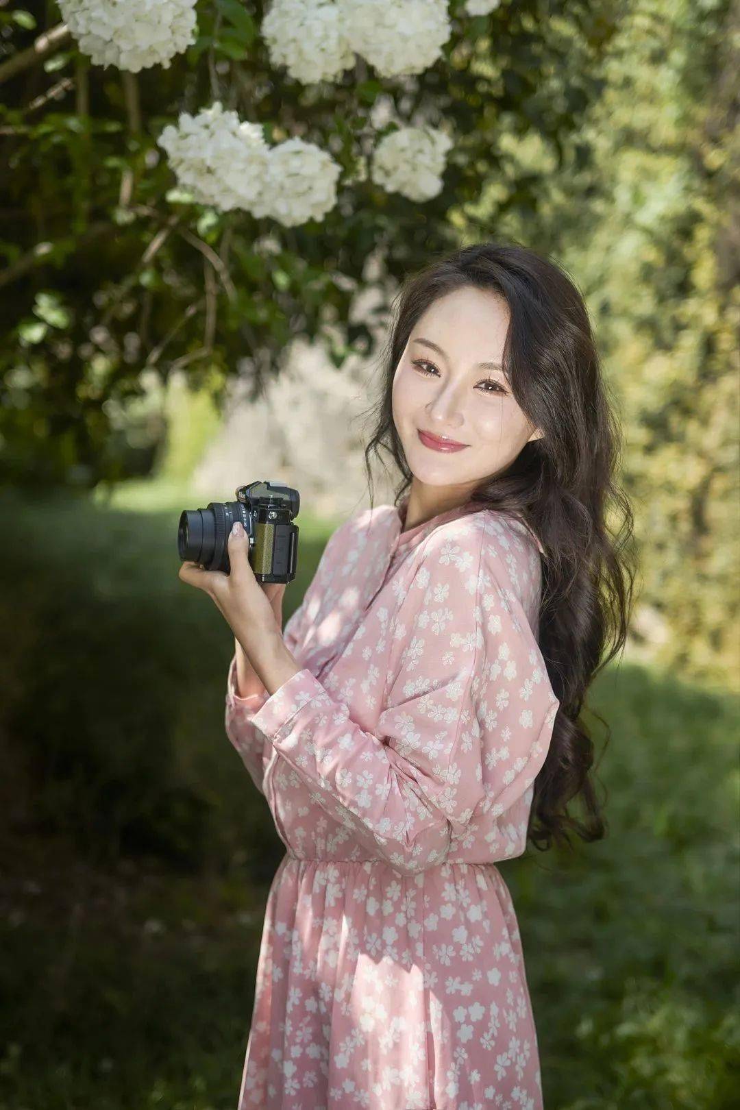 茂密的绣球花点缀在绿叶丛中很唯美。但在拍摄半身人像的时候,也会常常遇到背景杂乱、人物不够突出的情况,因此我选择使用这支焦距更长的尼克尔 Z 40mm f/2镜头进行拍摄,并全程将镜头光圈开到最大的f/2,利用虚化来营造氛围感的同时,模糊杂乱的背景,从而烘托人物主体。多亏了尼康Z fc所具备的眼部侦测自动对焦功能,在大光圈下也可以轻松锁定人眼,从而无需担心人眼焦点不实的情况,让我专注于定格人物更为自然的姿态。