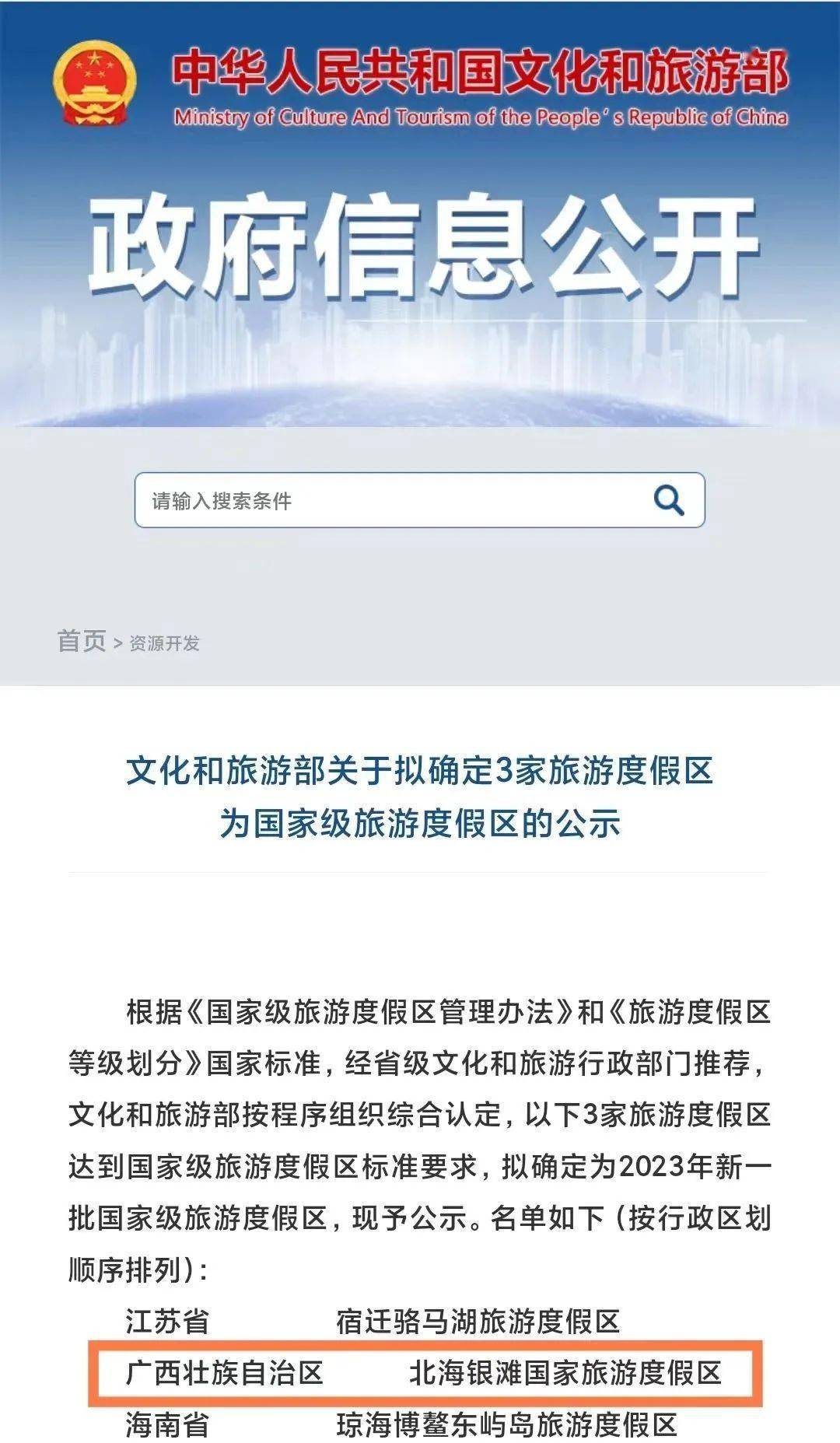 今日,文化和旅游部网站发布关于拟确定3家旅游度假区为国家级旅游度假区的公示, 北海银滩国家旅游度假区位列其中!