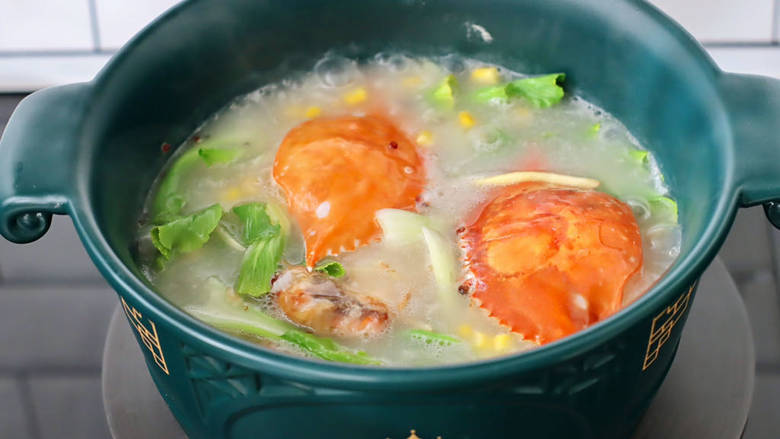 7.加入玉米粒,大火烧开,加入煎好的梭子蟹