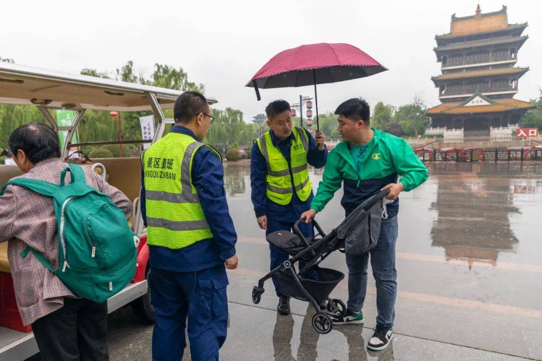 假期最后一天突降大雨,景区为游客免费发放雨具,提供电瓶车接送服务,让游客们度过祥和而又快乐的五一假期。