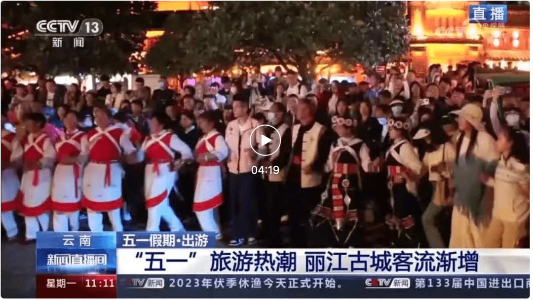 央视新闻也在5月1日报道《“五一”旅游热潮 丽江古城客流渐增》。