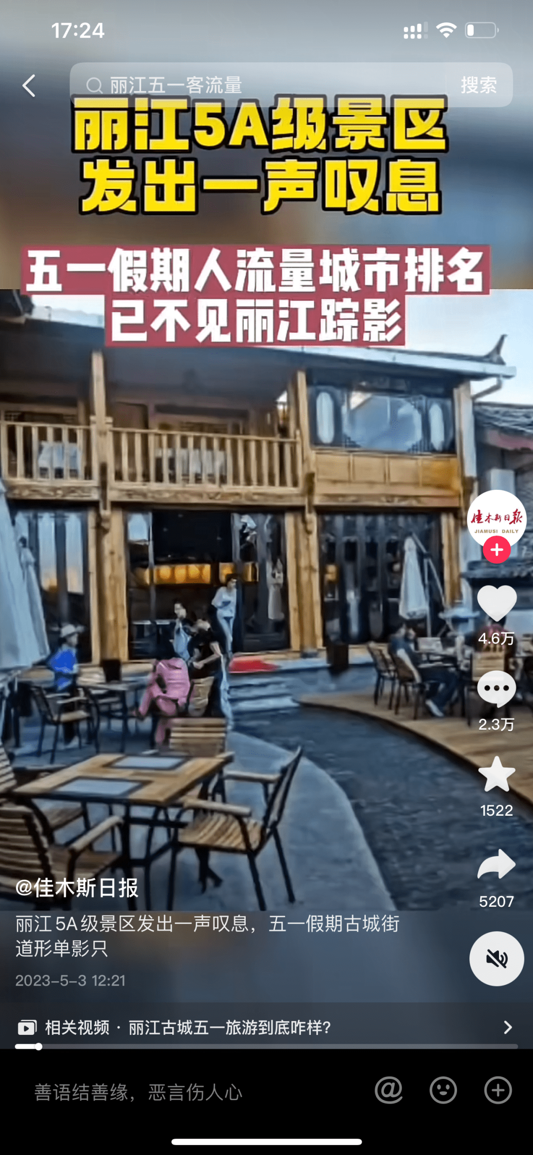 近日,有不少“丽江旅游遇冷”、“丽江爆冷”的短视频和消息在网络流传。
