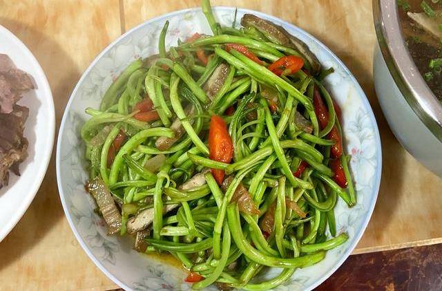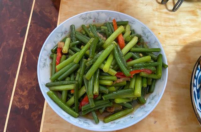 【炒蒜苗】这道菜的菜名是非常有争议的,在我们这里叫蒜苗,而其他有的地方,又叫蒜薹、蒜豪等,它烹炒起来也很快手,将咸肉热油下锅,煸炒出油脂后,倒入蒜苗,大火炒约3分钟,倒入红辣椒,再调入盐、生抽,继续炒个1分钟左右,就能出锅了。