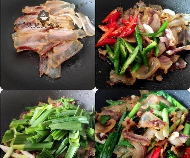 我家今年做了两种培根,一种味噌肉,只加一种盐和香料腌制的培根,今天做的是盐腌制的培根,因为没有加味增材料,培根的颜色看起来很淡但煮成片后油闪闪发光,光吃都很好吃,因为这玫瑰花肉比较肥,加蒜苗一起炒,配上辣椒和辣椒,炒一下,以免油腻为了不让香味腻,把这道菜炒一下,煮培根再炒,炒不干不硬,更好吃,如果培根很咸的话,请不要放盐,加适量的生鱼片调整味道就可以了。